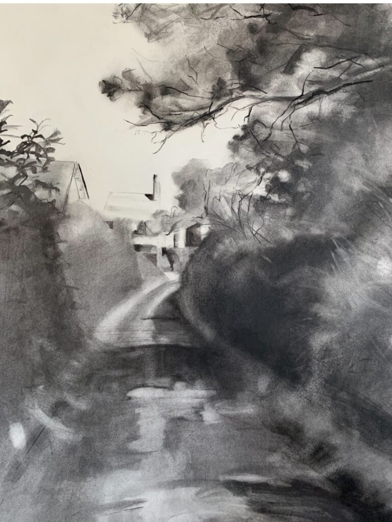 Bettiscombe, Charcoal and Oil on Paper 57 cms x 64 cms Oak Frame by Geraint Davies